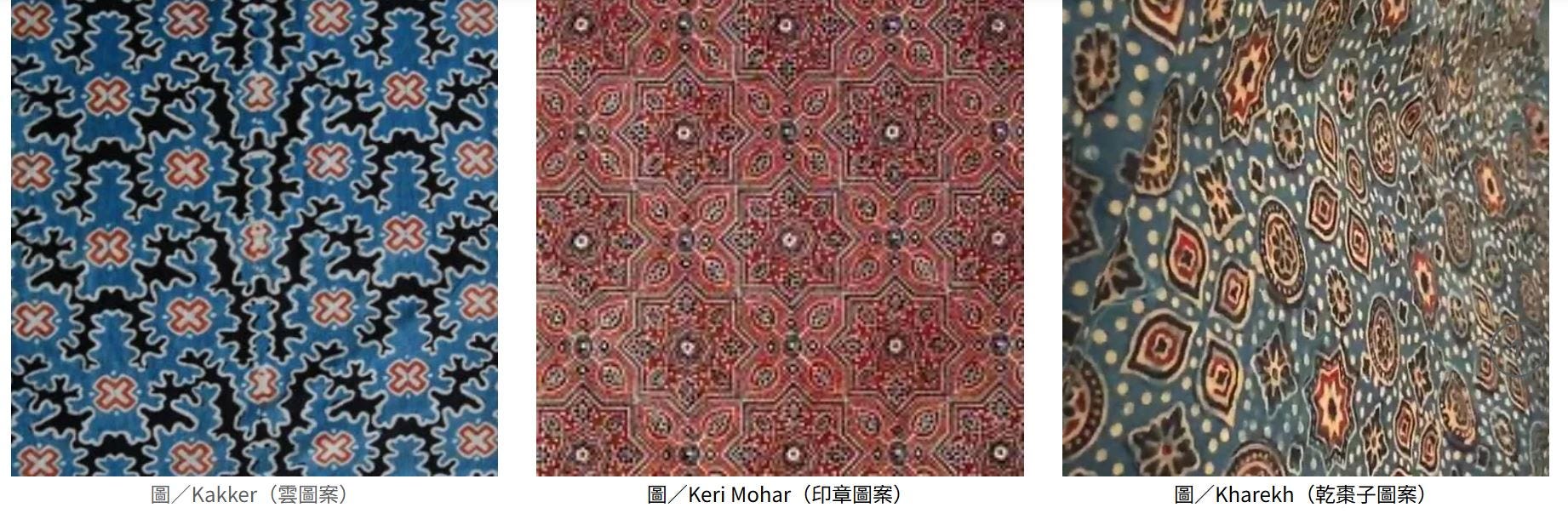 傳統蓋染以深紅與靛藍為兩大主色,少量使用白色和黑色,這樣的用色被認為是以天空為主題:藍色表示藍天,紅色為黃昏,夜晚用黑色表示,白點代表星星。上頭的印花圖案「Jaal」,更是如萬花筒般充滿變化,這些圖案受到自然和其他生活方式物品的啟發,並遵循伊斯蘭文化,不描繪人類或動物形象。