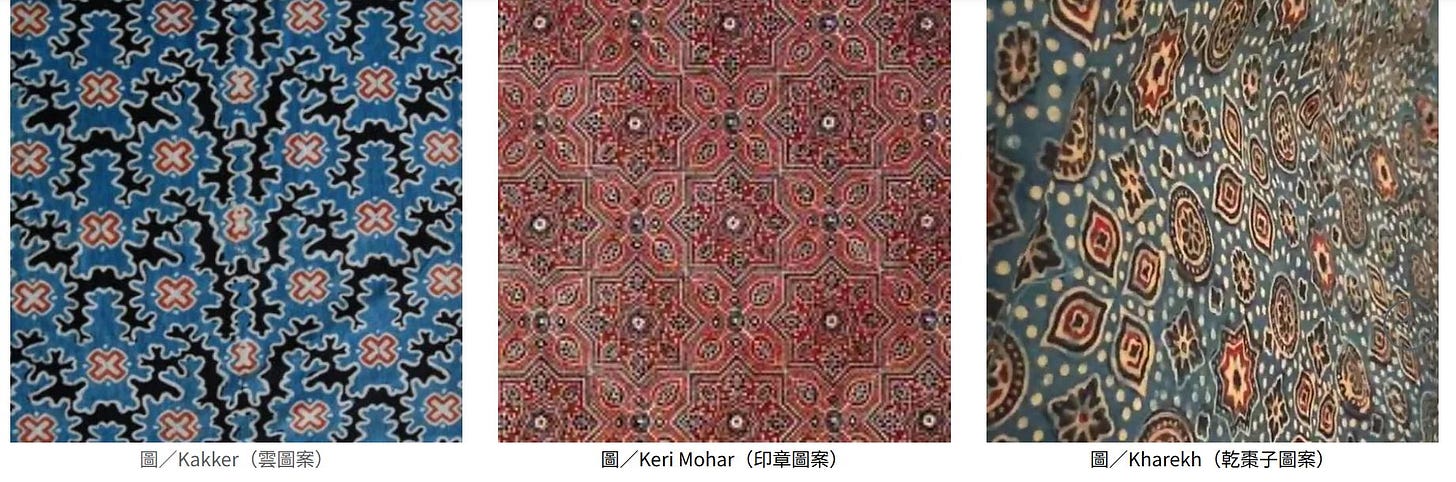 別看蓋染用木章蓋印圖騰好像很簡單,巴基斯坦蓋染工坊創辦人Noorjehan Bilgrami在她1990年出版的《Sindh Jo Ajrak》書中提到,刻一塊木蓋印花章需要五位雕刻師花上至少三天時間,蓋染從清洗棉布、浸泡、蓋章、染布更多達21道工序,而且每一種顏色都需要單獨的印花章,一塊布可能有四到五種顏色,就需要蓋四到五次。