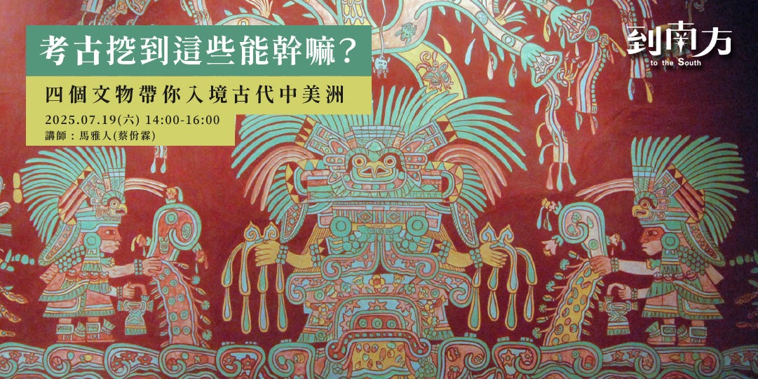 因此第二場「到南方講堂」,邀請到對中美洲文明高度狂熱的「馬雅國駐臺辦事處」大使馬雅人,從馬雅提卡爾31號石碑、齊秦伊札的羽蛇神廟、特奧蒂華甘的Tlaloc樂園壁畫、阿茲特克的太陽曆法石四個他深入鑽研的文物開始,一起登入古代中美洲。